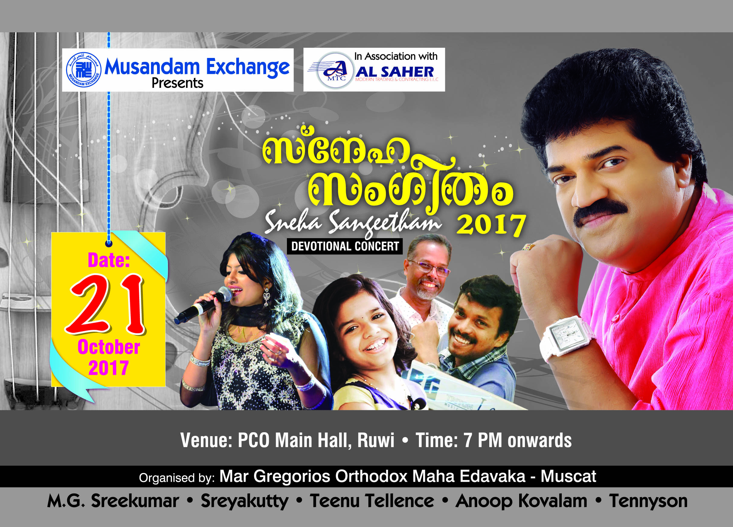 അറബ് സംസ്കാരത്തിന്റെ ഈറ്റില്ലമായ ഒമാന്റെ മണ്ണിൽ 45 വർഷങ്ങൾ പൂർത്തിയാക്കുന്ന മസ്‌ക്കറ്റ് മാർ ഗ്രീഗോറിയോസ്‌ ഓർത്തഡോൿസ് മഹാ ഇടവക അതിന്റെ ആഘോഷ പരിപാടികളുടെ ഭാഗമായി 2017 ഒക്ടോബർ 21 ന് റൂവി പി. സി. ഒ ഹാളിൽ വെച്ച് വൈകിട്ട് 7 ന് സ്നേഹ സംഗീതം 2017 എന്ന പേരിൽ ഒരു സംഗീത വിരുന്ന് അണിയിച്ചൊരുക്കുന്നു. പ്രശസ്ത ചലച്ചിത്ര പിന്നണി ഗായകൻ ശ്രീ: എം.ജി ശ്രീകുമാറിനോടൊപ്പം കേരളത്തിന്റെ കൊച്ച് വാനമ്പാടി ശ്രേയ ജയദീപ്, ടീനു ടെലൻസ്, പ്രശസ്ത കീബോർഡിസ്റ്റ് അനൂപ് കോവളം എന്നിവരും അണി നിരക്കുന്നു. ഈ സംഗീതോത്സവത്തിലേക്ക് ഏവർക്കും ഹൃദ്യമായ സ്വാഗതം
