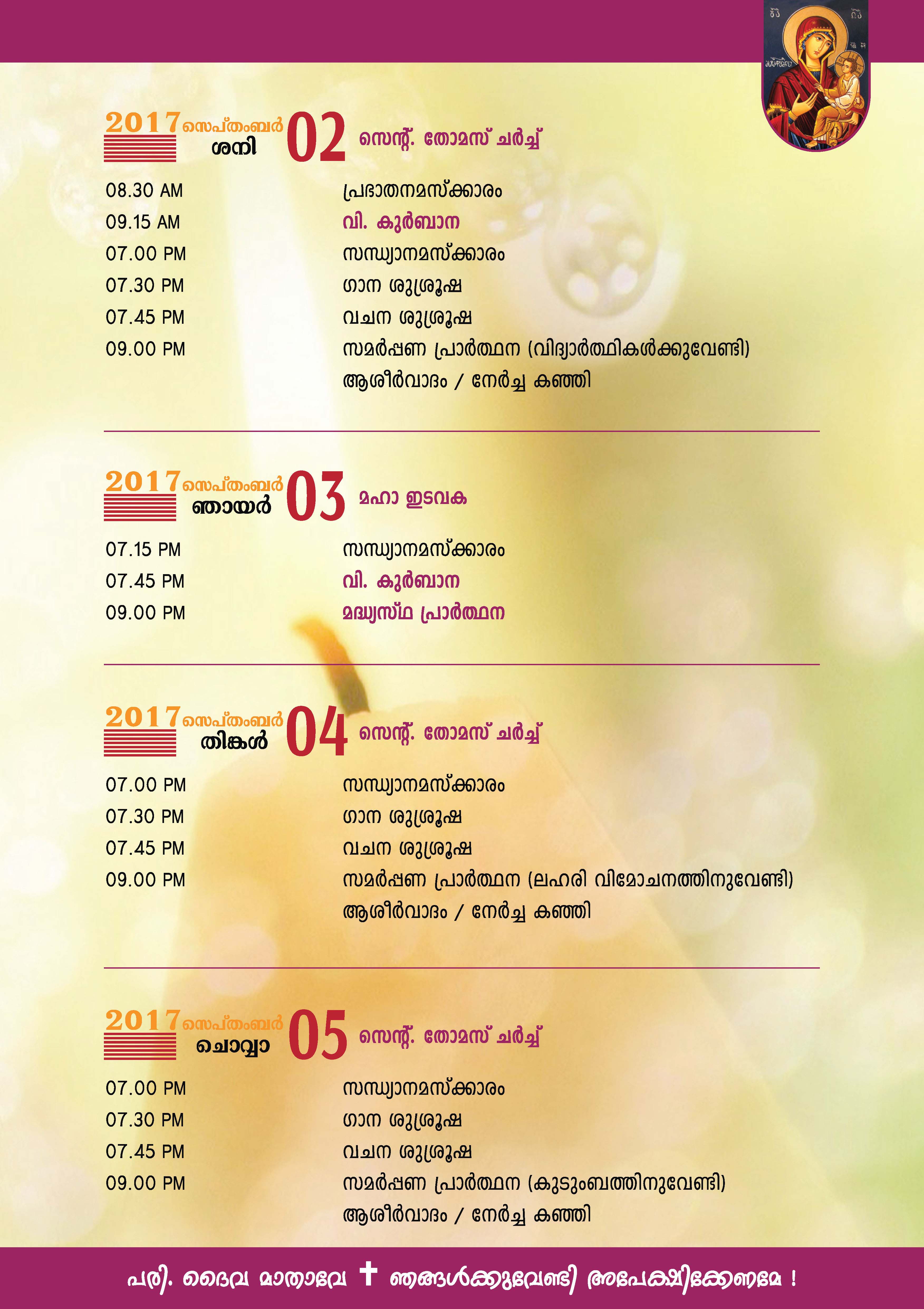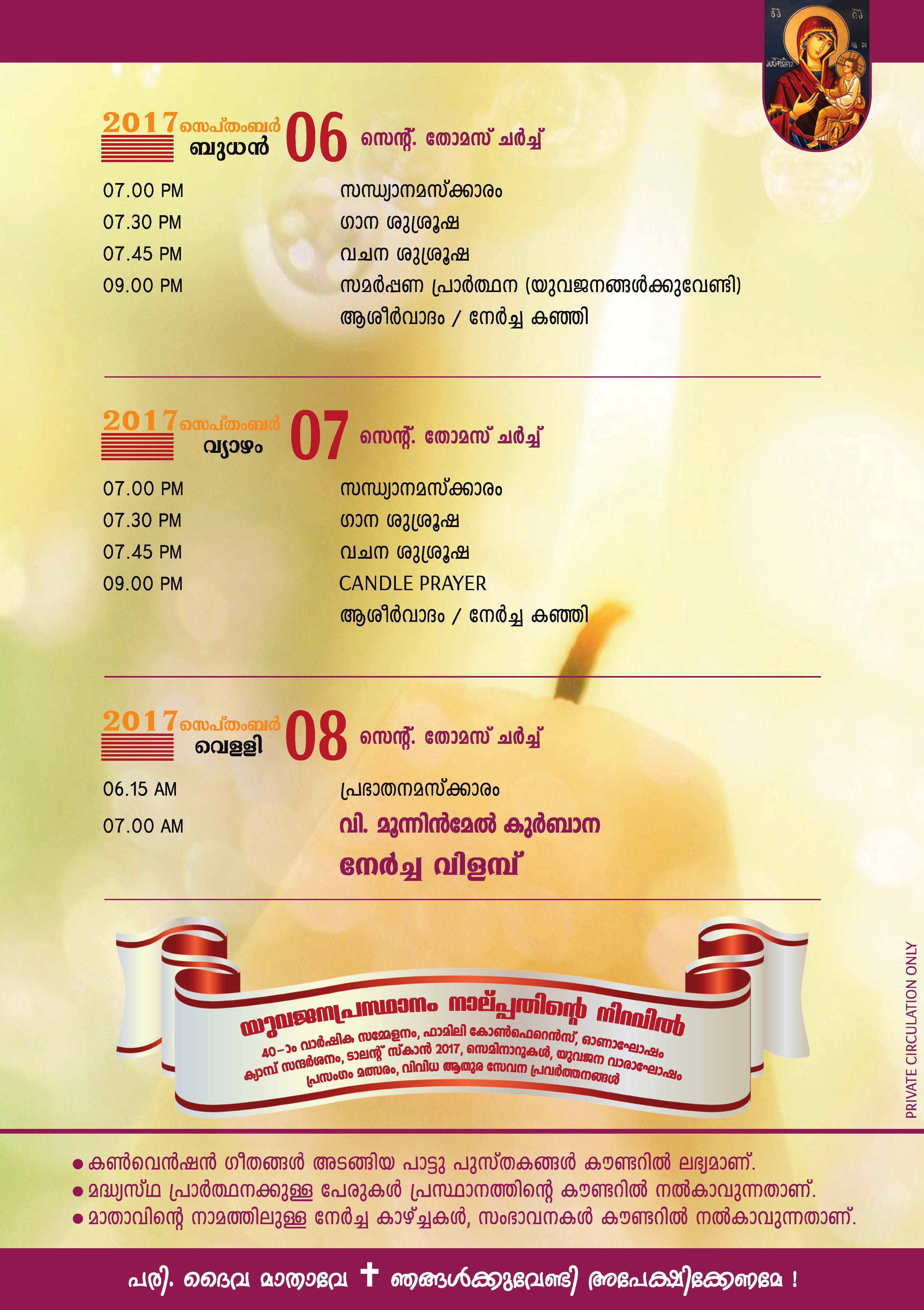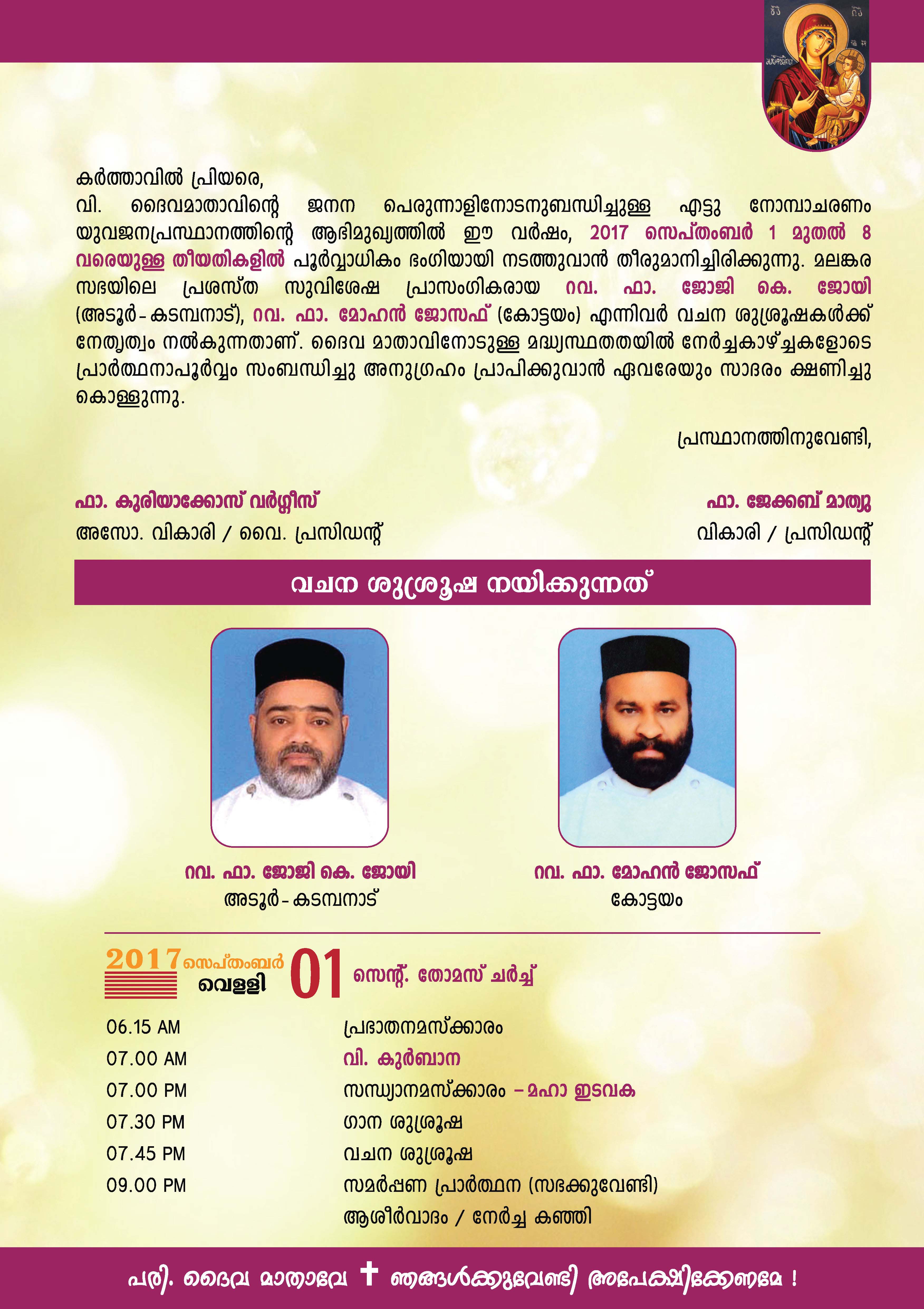 വിശുദ്ധ ദൈവമാതാവിന്റെ ജനനപ്പെരുന്നാളിനോട് അനുബന്ധിച്ചുള്ള എട്ടുനോമ്പാചരണവും സുവിശേഷ പ്രസംഗവും 2017 സെപ്റ്റംബർ 1 മുതൽ 8 വരെ യുവജന പ്രസ്ഥാനത്തിന്റെ നേതൃത്വത്തിൽ മസ്കറ്റ് മാർ ഗ്രീഗോറിയോസ് ഓർത്തഡോക്സ് മഹാ ഇടവകയിൽ നടത്തപ്പെടുന്നു. സെപ്റ്റംബർ 1 മുതൽ 7 വരെ എല്ലാ ദിവസവും വൈകിട്ട് 7 മുതൽ സന്ധ്യാ നമസ്കാരവും തുടർന്ന് സുവിശേഷ പ്രസംഗവും. പെരുന്നാൾ ദിവസമായ സെപ്റ്റംബർ 8 ന് രാവിലെ പ്രഭാത നമസ്ക്കാരവും, വിശുദ്ധ മൂന്നിന്മേൽ കുർബ്ബാനയും, മദ്ധ്യസ്ഥ പ്രാർതഥനയും, ആശിർവാദവും നേർച്ച വിളമ്പും ഉണ്ടായിരിക്കും